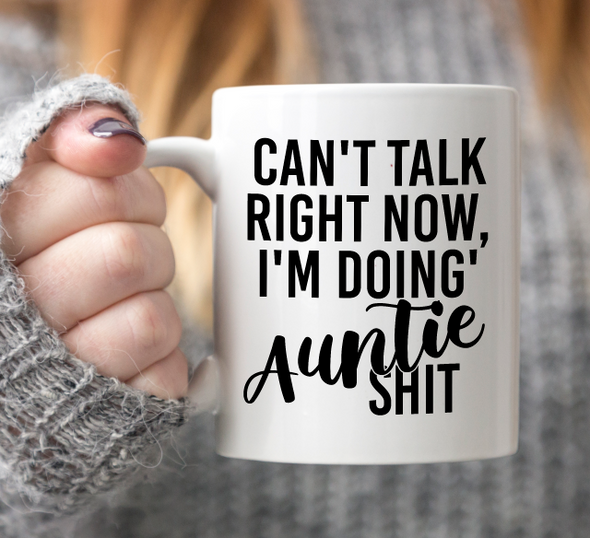 Can't Talk Right Now I'm Doing Auntie Shit Our mugs are sourced from industry leading suppliers to provide consistant quality. We take pride in ensuring all of our products exceed customers expectations. 11oz Gloss Finish...