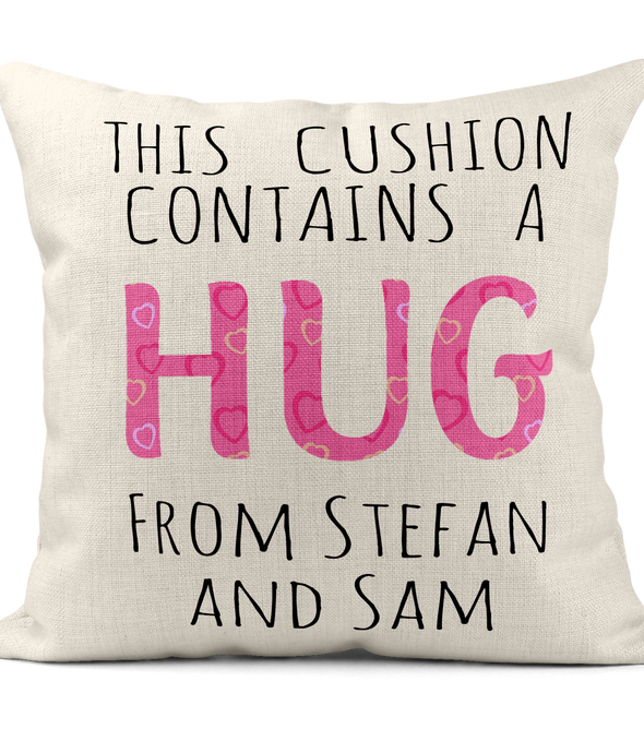 This cushion contains a HUG - personalised with any name(s)CUSHION SPECIFICATIONS❤️️High Quality Print❤️️Personalised❤️️Zip fastening❤️️Cushion size 40 cm x 40 cm Square,❤️️Cushion filler included❤️️Machine wash at 30 degrees❤️️Do Not Tumble DryPLEASE ADD REQUIRED NAMES IN THE...