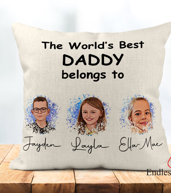 Personalised Daddy Belongs to Cushion, with upto 3 photos / names printed along the bottom. Product Features: - Printed using dye sublimation with high quality inks- Permanent design, the design will not fade of come...
