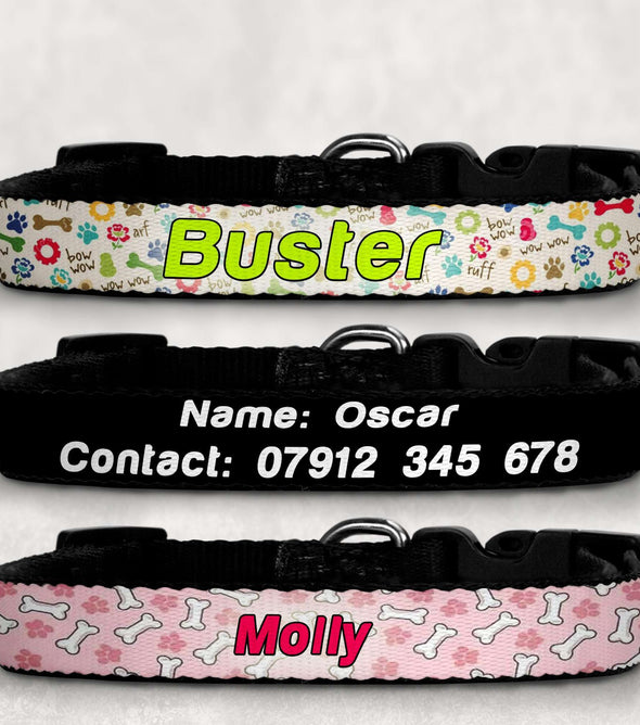 Small personalised dog collar with metal loop for clipping pet lead to and a plastic heavy duty buckle to fasten collar together, durable with stitched on printabled panel. These can include a dogs name with...