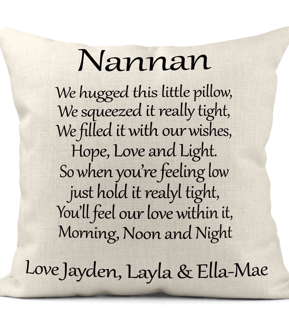 This cushion contains a HUG - personalised with any name(s)CUSHION SPECIFICATIONS❤️️High Quality Print❤️️Personalised❤️️Zip fastening❤️️Cushion size 40 cm x 40 cm Square,❤️️Cushion filler included❤️️Machine wash at 30 degrees❤️️Do Not Tumble DryPLEASE ADD REQUIRED NAMES IN THE...