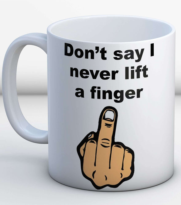 Don't say I never lift a finger Mug Our mugs are sourced from industry leading suppliers to provide consistant quality. We take pride in ensuring all of our products exceed customers expectations. 10oz Gloss Finish...